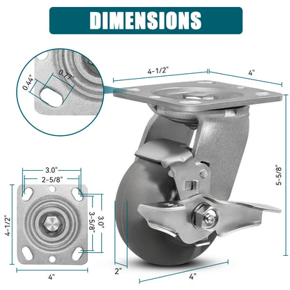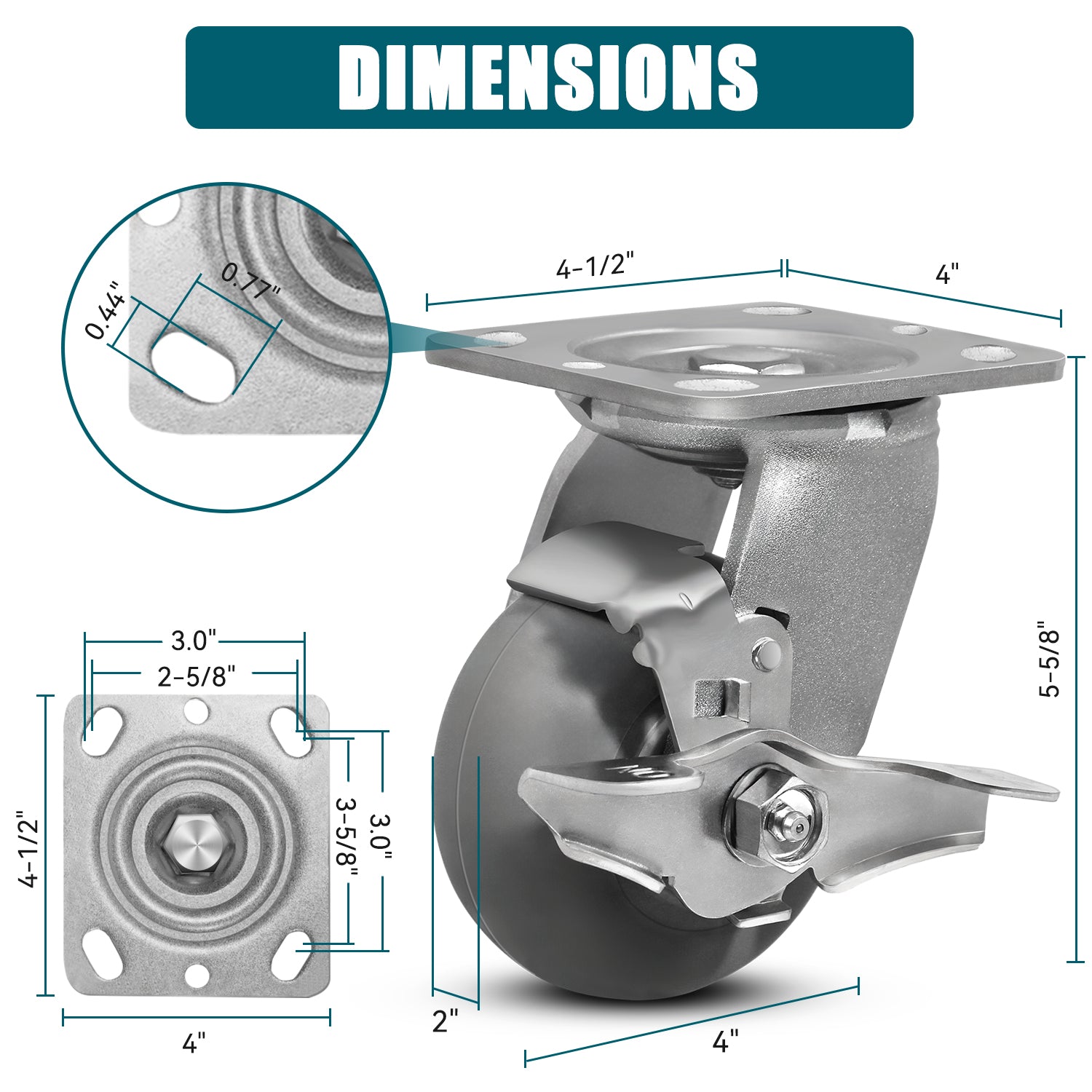 HEAVY DUTY TOP PLATE: Measuring 4" x 4-1/2", this plate size is engineered for stability and strength. Ideal for ensuring a solid foundation for casters and wheels, it accommodates a broad spectrum of applications, from heavy-duty industrial equipment to everyday utility carts, enhancing safety and reliability with its robust build and precise dimensions.