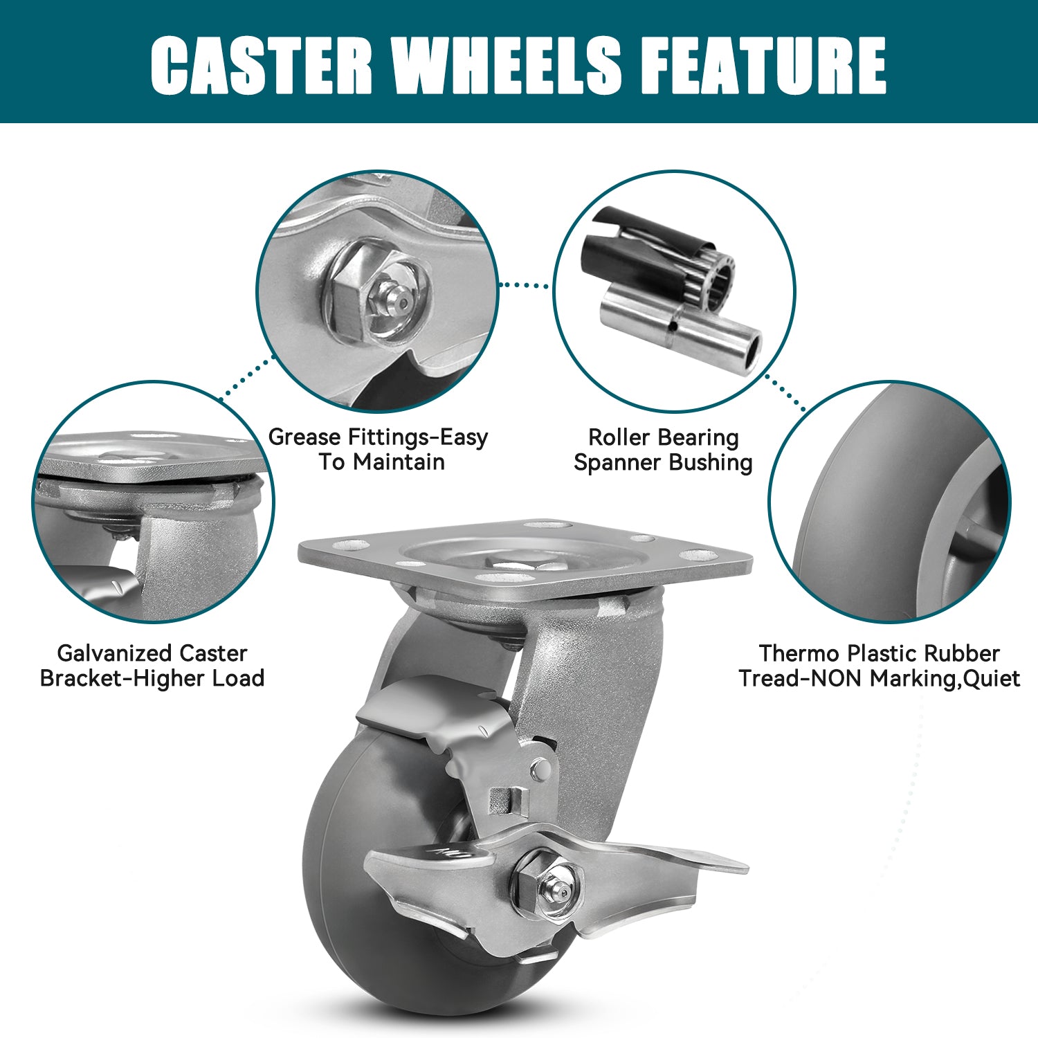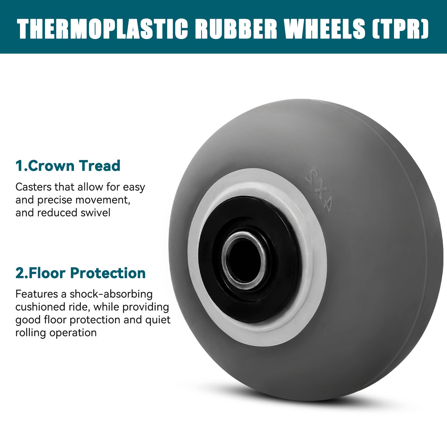 - NON-MARKING CASTERS:CWfutureparts's Crowned Thermoplastic Rubber (TPR) wheels are built for durability and performance. Featuring a non-marking gray TPR tread bonded to a Polyolefin core,these wheels are softer than a standard polyurethane wheel you would normally use.