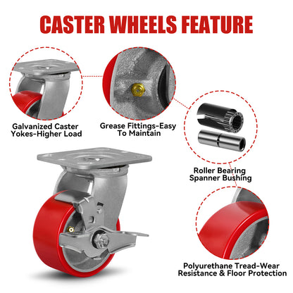 The caster wheel features a roller bearing design that enhances load capacity and durability. This reduces friction, allows for higher speed limits, and makes movement smoother. Combined with a 360-degree swivel top plate, it enables effortless changes in direction with minimal effort.